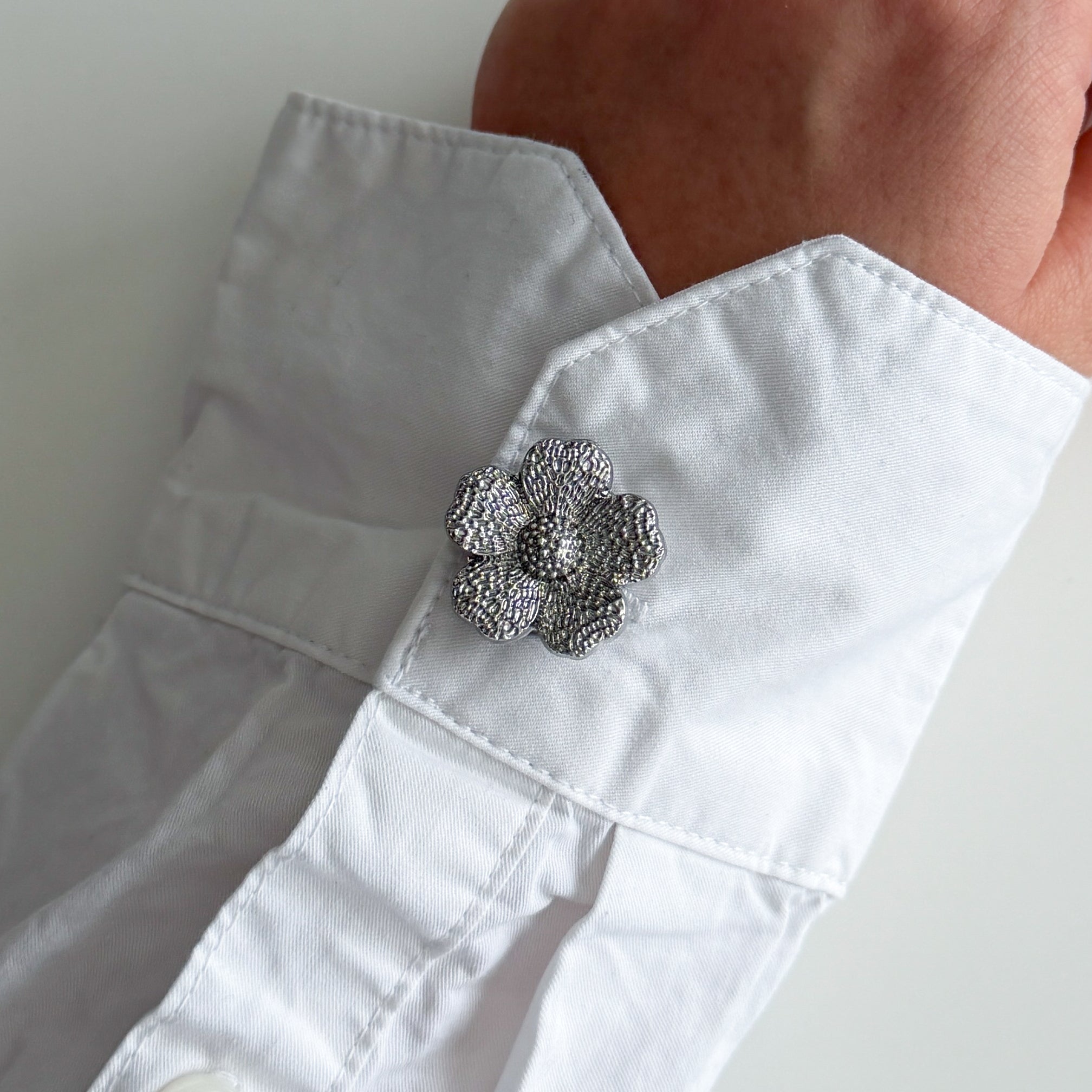 Netha är ett Hello Billie Signature-knappsmycke med en strukturerad yta som ger ett fantastiskt liv åt din look. Med sin organiska blomform och silverton skapar den en lyxig men minimalistisk känsla som lyfter allt från den enklaste vardagsskjortan till din mest eleganta blus.