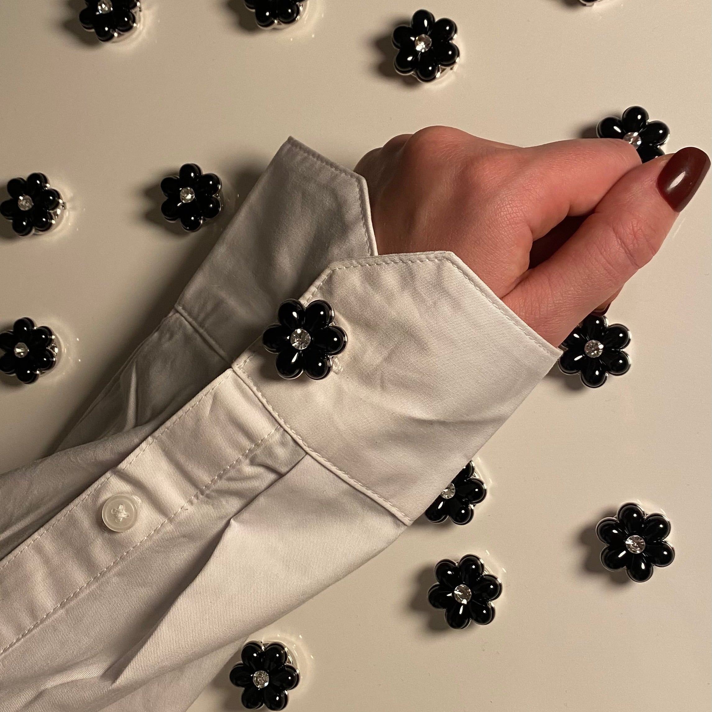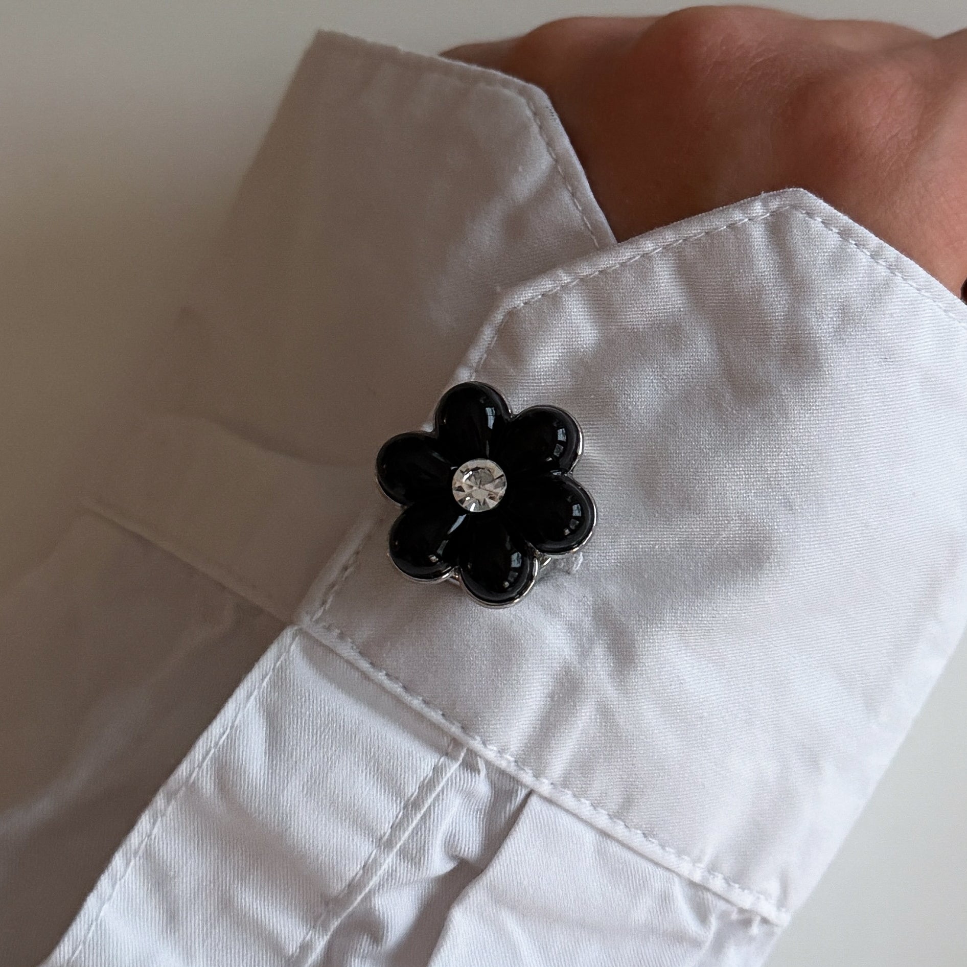 Detta fina knappsmycke i svart och silver, med form av en blomma, ger din skjorta eller blus nytt liv. Knappsmycket klickas enkelt fast på knappar upp till ca 15 mm - en fin detalj som höjer din outfit till en ny nivå.
